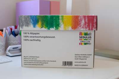 Sedulus-Office Recycling Kopierpapiere bestehen aus 100% Altpapier. Das hochwertige Papier mit 80g Flächengewicht besitzt eine hohe Weiße und ist für alle handelsüblichen Drucker geeignet. Über eine Klappe öffnet sich der Karton nach vorne, damit das Herausnehmen des Papiers erleichtert wird. Sedulus Office Produkte entstehen in manueller Fertigung mit der Unterstützung der Werkstattbeschäftigten der Papierwerkstätten. Die enthaltene Arbeitsleistung nach §223 SGB IX können sich Betriebe mit einer Größe ab 20 MitarbeiterInnen auf ihre Ausgleichsabgabe anrechnen lassen. Eine Packung Sedulus Office Kopierpapier kosten dann für Dein Unternehmen nur noch 18,75 €/netto und somit 4,69 €/netto pro 500 Blatt.
